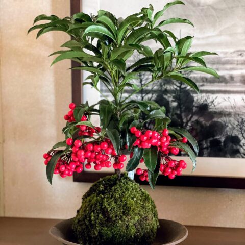 年末年始に渡って多種の植物を苔玉に仕立てました。シクラメン、カランコエ、ミニチュアローズ、小型のコチョウラン等の比較的洋風な花物等々、また、クロマツ、アカマツ、ゴヨウマツ、ウメ、ミリオンバンブー、マンリョウ、ヒャクリョウ、ジュウリョウ等の和風植物・・・・・でした。